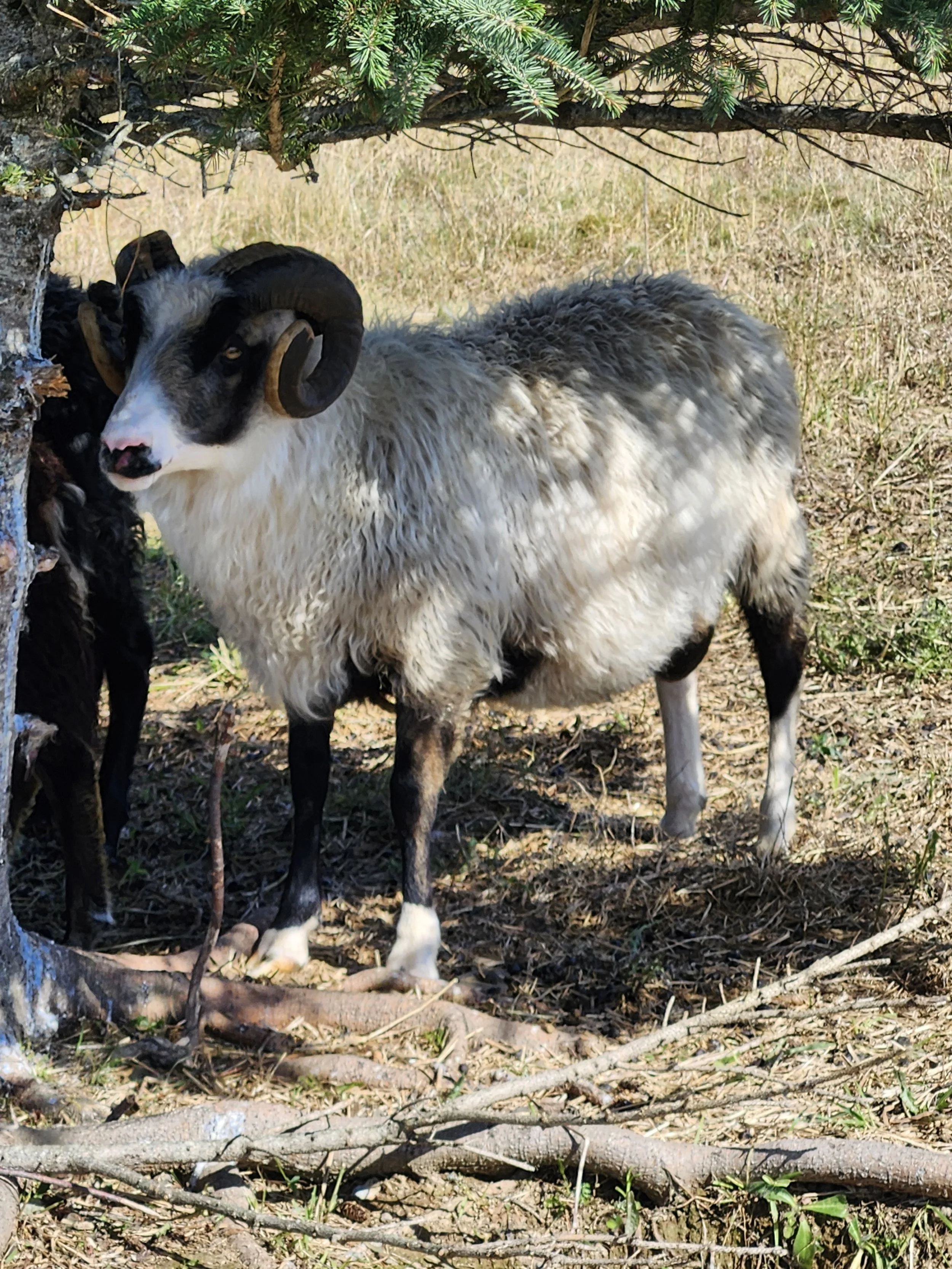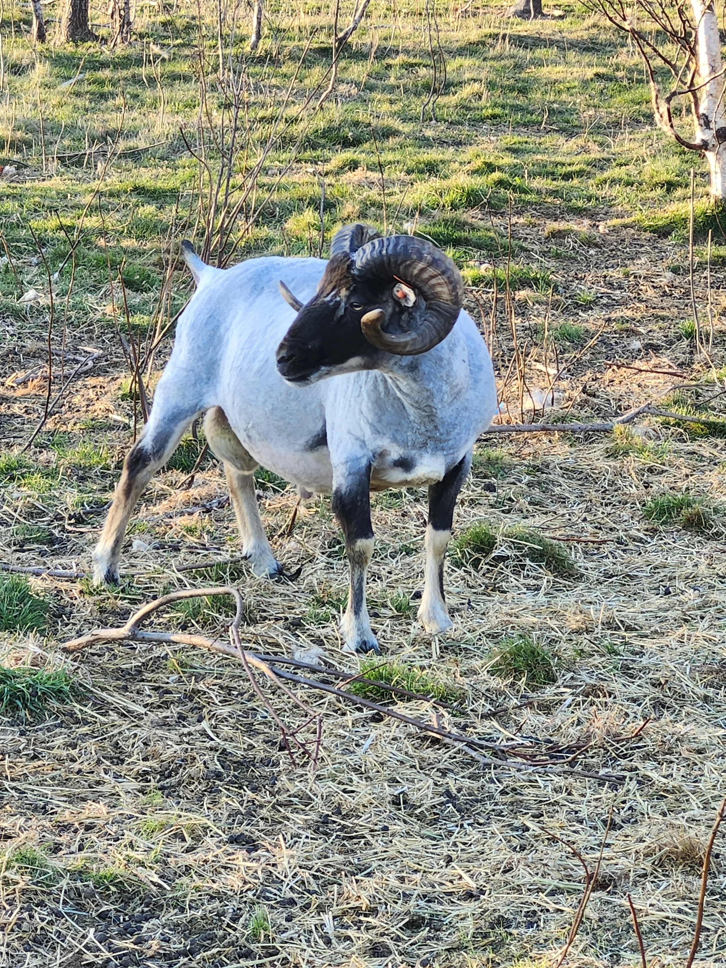 2024 Single ram out of Sweet Pasture Pies Leif and Ledge Hill Duilwen. Heterozygous white with his second pattern Black Mouflon. Finn is the grand nephew to our ewe Una, and we just love everyone in this family really. They are some of the best sheep.